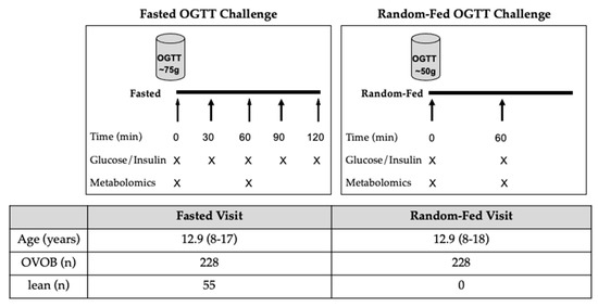 The following are available online at https://www.mdpi.com/article/10.3390/nu13103365/s1, Figure S1: Oral glucose tolerance test specifications for the Fasted and Random-Fed Visits., Figure S2: Analysis objectives., Figure S3: Sex differences., Figure S4: Metabolic Set Enrichment Analysis between BMI groups at the Fasted OGTT Challenge., Figure S5: Trajectory of the metabolome between t0 and t60 min within groups., Figure S6: Metabolite response differences between OVOB and lean participants during the Fasted OGTT Challenge., Figure S7: Distribution of HOMA-IR measures in OVOB participants, stratified by males and females., Table S1: Characteristics of study participants at the Fasted Visit, stratified by sex., Table S2: Metabolites associated with OVOB and lean participants at the Fasted Visit., Table S3: Metabolites associated with sex at the Fasted Visit., Table S4: Metabolite alterations in response to the OGTT within each group (lean and OVOB) and state (fasted and random-fed)., Table S5: Glucose and insulin levels at the Fasted and Random-Fed Visits for OVOB adolescents., Table S6: Metabolites differentially associated with the fasted and random-fed state in OVOB., Table S7: Sex stratified relationship between metabolites and HOMA-IR in OVOB.