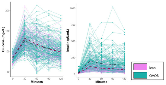 Kinetics of blood glucose and insulin response to the glucose test at the Fasted Visit. OVOB and lean participants arrived fasted prior to the consumption of the glucose challenge. Blood glucose and insulin were profiled before and during the OGTT. Mean values reported for lean (dark pink dash) and OVOB (dark slate gray dash). OVOB, overweight and obese.