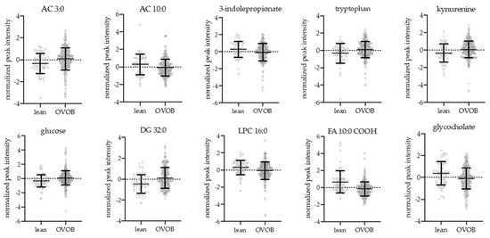 Descriptive statistics were computed for categorical variables (Pearson’s chi-square test) and continuous variables (unpaired Students’ t-test), stratified by OVOB and lean. Sex-stratified analyses were evaluated. Main analysis objectives are outlined in Figure S2. Peak intensities (PI) of metabolites were utilized for statistical analyses.