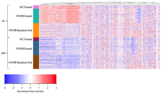 The response of the metabolome to an OGTT is represented in Figure 4, stratifying individuals by state (Fasted and Random-Fed), time (t0 and t60), and group (lean and OVOB). Metabolites peak intensities were centered across all samples and metabolites were grouped using hierarchical clustering to identify groups of metabolites with similar dynamics during the OGTT. Significant changes in metabolite levels from t0 to t60 are reported, including alterations in 68% of metabolites in lean during the Fasted OGTT Challenge (Figure S5a), 84% of metabolites in OVOB during the Fasted OGTT Challenge (Figure S5b), and 77% of metabolites in OVOB during the Random-Fed OGTT Challenge (Figure S5c) (FDR < 0.05). Most metabolites decreased in response to the OGTT, which may be attributed to the high abundance of lipids within the annotated metabolites in this dataset. Metabolite classes that consistently decreased in response to the OGTT include medium- and long-chain ACs, FFA, and lipids, such as SMs, PCs, and DGs. The metabolite with the largest increase was hippurate, increasing at approximately 4 log2FC in each group. As reported by Shaham et al. [2], this likely reflects the metabolism of the preservative benzoic acid, found in the glucola beverage used for the OGTT [30]. All paired t-tests are reported in Table S4.