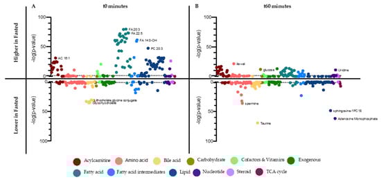 Differential metabolites between Fasted and Random-Fed in OVOB. Linear regression analyses identified metabolites associated with OVOB-Fasted and OVOB-Random-Fed (ßstate) at (A) t0 and (B) t60. On the top of the plots, metabolites are reported that are higher in OVOB-Fasted (ßstate < 0), with position indicated by −log10 (p-value). On the bottom of the plots, metabolites are reported that are lower in OVOB-Fasted (ßstate > 0), with position indicated by −log10 (p-value). Metabolites are listed in the same order in 5A and 5B. Colors indicate metabolite class. Horizontal lines (dotted) signify FDR = 0.1. Several distinguishing metabolite names are listed. Age and sex are included in the model.