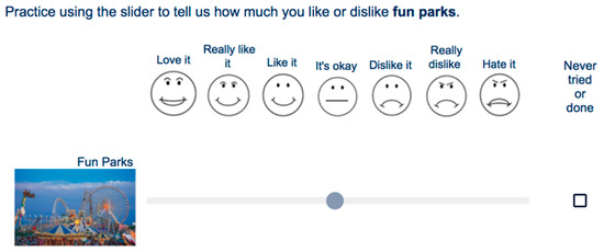 Sample question from the online survey with the hedonic facial scale, picture of the item, moveable scale, and ability to report “never tried or done”.