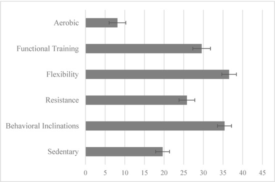 Overall, physical activity was generally liked by the study sample (Figure 2). The average liking of physical activity groups (aerobic, functional, flexibility, resistance, and behavioral inclinations) was higher than average liking of sedentary behaviors (mean(s): 28.1 ± 1.4 SE vs. 19.6 ± 1.8 SE; t(225) = 3.86; p < 0.001). Reported liking of individual physical activity groups averaged between a neutral rating (“it’s okay”) and liking rating, demonstrating a positive preference for physical activity in this sample, ranging from the lowest average liking of aerobic activities (nearing “it’s okay”) to flexibility exercises and behavioral inclination categories averaging at “like it.” Liking of aerobic exercises was significantly different from that of all other exercise groups (functional training t(232) = −7.70, p < 0.001; flexibility: t(250) = 10.88, p < 0.001; resistance: t(238) = −6.11, p < 0.001; general Exercise t(250) = −14.47, p < 0.001).