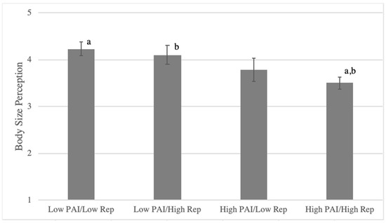 Body size perception among concordant/discordant groups in PAI (physical activity liking index) versus reported frequency of physical activity in college women; according to the Figure Rating Scale [55] 1–2 = underweight, 3–4 = normal weight, 5–6 = overweight, and 7–9 = obese. Matching letters denote significant difference (p < 0.05).