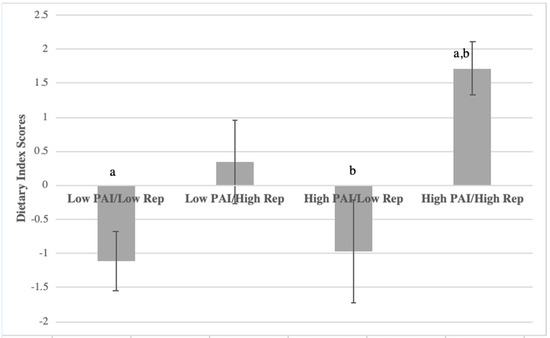 Average dietary index scores among concordant/discordant groups in PAI (physical activity liking index) vs. reported frequency of physical activity in college women. Dietary index scores (diet quality) were the sum of weighted consumption fruits, vegetables, sweets/salty snacks, and sugary beverages where >4 = healthier scores and <−7 = less healthy scores. Matching letters denote significant difference (p < 0.05).