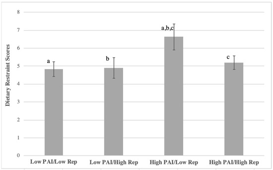 Overall, dietary restraint was not significantly different among the concordant/discordant groups (F(3, 251) = 1.628, p = 0.184) (Figure 6). However, the greatest dietary restraint was seen in those with high physical activity liking and low frequency of physical activity. Post hoc analysis showed that this group significantly differed from the group with both low liking and frequency of physical activity.