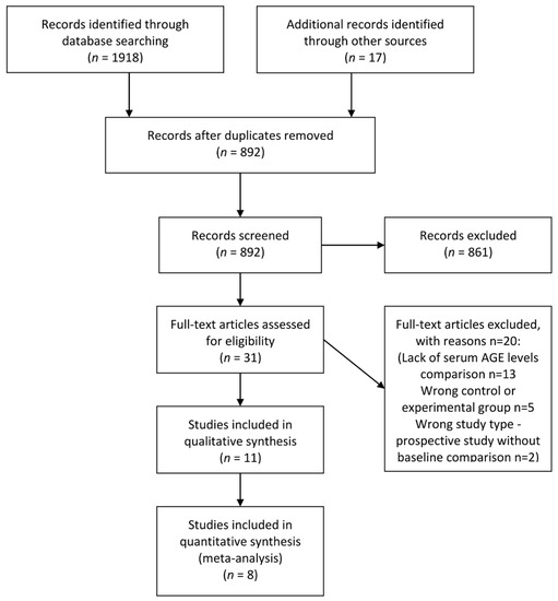 Diagram of the study selection process (adapted from PRISMA). AGE—advanced glycation end-product.