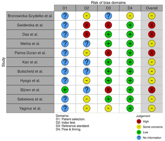 - Whiting, P.F.; Rutjes, A.W.; Westwood, M.E.; Mallett, S.; Deeks, J.J.; Reitsma, J.B.; Leeflang, M.M.; Sterne, J.A.; Bossuyt, P.M.; QUADAS-2 Group. QUADAS-2: A revised tool for the quality assessment of diagnostic accuracy studies. Ann Intern. Med. 2011, 155, 529–536. [Google Scholar] [CrossRef] [PubMed]
