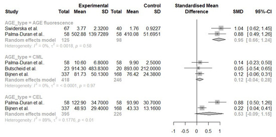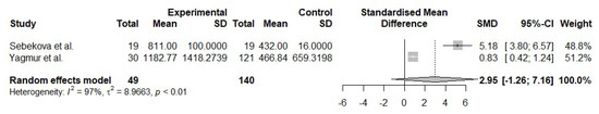 Patients with AC had higher levels of CML compared to healthy controls (SMD 2.95, CI −1.26; 7.16). However, the comparison had very high heterogeneity (I2 = 97%, p < 0.01), which most likely stems from the extraordinarily high effect size reported by Sebekova et al. (5.18 SMD, Figure 4) [38]. The number of studies obtained for each comparison was too small to assess publication bias using statistical methods such as Egger’s test.