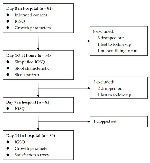 To examine whether the effects of feeding intervention manifested earlier, a simplified IGSQ containing 4 questions, i.e., times of vomiting, times of flatulence, duration of crying, times of fussiness in the past 24 h, was adopted to collect detailed information in the 3 days of feeding intervention. The score for each of the 4 questions also ranged from 1 to 5. Information on stool and sleeping in the first three respective days was also collected. Information on stool included frequency, pain, and consistency (watery, runny, mushy, firm, or hard); information on sleeping included sleeping hours and times of wake-ups at night. In addition, growth parameters for infants who wore indoor light clothing without shoes at Day 0 and Day 14 were measured by trained health providers, including length, weight, and head circumference. Body mass index (BMI, kg/m2) was calculated as weight in kilograms divided by squared height in meters. An age- and sex-specific Z-score of each parameter was calculated according to the WHO child growth standards [20]. At Day 14, parents were interviewed to answer the question, “are you satisfied with the feeding intervention”. For the question, there were three choices: so-so, satisfied, and un-satisfied. Throughout the study, adverse events or parents’ concerns were recorded and checked by health professionals. The flow chart is shown in Figure 1.