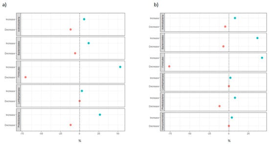 (a) mirror bar chart of the number of significant taxa in each family of Firmicutes phylum over the total number of significant taxa in each family of Firmicutes phylum found in the non-supplementation group of studies: for each family, the violet bar indicates the number of significant taxa in the family that increased with increasing levels of VD serum levels or dietary intake, over the total number of significant taxa in Firmicutes that increased with increasing levels of VD serum levels or dietary intake (expressed in percentages); the orange bar indicates the number of significant taxa in the family that decreased with increasing levels of VD serum levels or dietary intake, over the total number of significant taxa in Firmicutes that decreased with increasing levels of VD serum levels or dietary intake (expressed in percentages); (b) Mirror bar chart of the number of significant taxa in each family of Firmicutes phylum over the total number of significant taxa of Firmicutes phylum found in the supplementation group of studies: for each family, the violet bar indicates the number of significant taxa in the family that increased after VD supplementation, over the total number of significant taxa in Firmicutes that increased after VD supplementation (expressed in percentages); the orange bar indicates the number of significant taxa in the family that decreased after VD supplementation, over the total number of significant taxa in Firmicutes that decreased after VD supplementation (expressed in percentages).