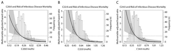 Association of standardized circulating VLSFA with risk of infectious disease mortality. Data were fitted by Cox proportional-hazards regression using mean C20:0 (0.24 mol%, A), C22:0 (0.57 mol%, B) and C24:0 (0.48 mol%, C) concentrations as reference value. The black line represents the hazard ratio and the grey area represents the 95% confidence interval.