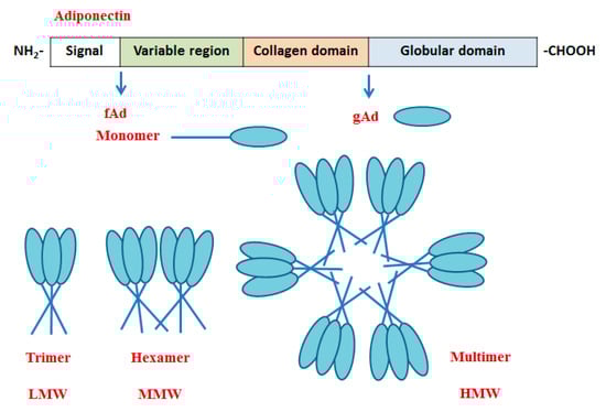The structure of adiponectin. fAd, full-length adiponectin; gAd, globular domain adiponectin; LMW, low molecular weight; MMW, middle molecular weight; HMW, high molecular weight.