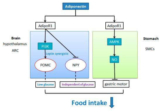 The receptors of AdipoQ including AdipoR1 and AdipoR2 were expressed by neurons (POMC and NPY neurons) in the rat hypothalamic nucleus [58]. In the hypothalamus arcuate nucleus (ARC), both POMC neuron and NPY/AgRP neuron project to other hypothalamic nuclei and then send projections to intrahypothalamic and extrahypothalamic regions to regulate appetite. The proopiomelanocortin (POMC)-expressing neuron, one of the key neurons in the brain, can be activated by nutritional and hormonal satiety signals to inhibit food intake of animals. Recent investigations on mice showed that AdipoQ significantly increased POMC neuronal membrane potential and the occurrence frequency of action potential through current clamp recording under a low concentration of glucose (5 mM) condition, which is to mimic fasted states [21]. Furthermore, the excitatory effect of AdipoQ on POMC neurons was reversed by phosphoinositol-3-kinase (PI3K) inhibitor [21,91] but not adenine monophosphate-activated protein kinase (AMPK) inhibitor [91]. Meanwhile, the effect of adiponectin on POMC neuronal activity was synergistically potentiated by leptin [91]. Sun et al. found that when leptin (100 nM) was co-incubated with AdipoQ (10 nM) or AdipoQ receptor agonist (AdipoRon, 5 μM) in mouse brain sections, the depolarization degree and action potential frequency of POMC neurons were significantly higher than that of AdipoQ administration [91]. Additionally, a previous study in mice showed that the effect of leptin on activation of POMC could also be blocked after inhibiting PI3K activity. These observations indicate that a synergistic effect might exist between AdipoQ and leptin in the regulation of POMC neurons. In summary, PI3K acts as a substrate for AdipoQ to inhibit food intake via acting on POMC neurons in rodents, and AdipoQ may cooperate with leptin to activate POMC neurons under a low concentration of glucose condition (Figure 3).