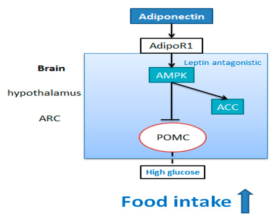 The stimulative effect of adiponectin on food intake. In the arcuate nucleus of the hypothalamus, adiponectin may bind to AdipoR1 in the arcuate nucleus of the hypothalamus to stimulate AMPK pathway and inhibit the excitation of POMC neurons. The inhibitory effect of AdipoQ on POMC neurons was closely related to high glucose concentration and AMPK pathway.