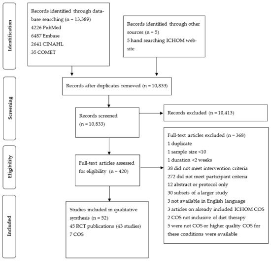 A total of 13,395 articles (13,354 RCT publications and 40 COS) were identified. After deduplication, 10,833 records remained and were screened for eligibility through the title and abstract. Full-text copies of 419 studies were screened in their entirety. In total, 52 articles were included in the review, of which 45 were RCT publications (from 43 studies) and 7 of which were COS. This process is illustrated in Figure 1.