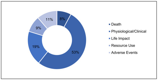 Across the 45 included publications (43 studies), a total of 66 different outcomes were reported, covering all five COMET taxonomy core areas and 25 of the 38 outcome domains. Physiological/clinical core area outcomes were the most frequently reported. All 45 (100%) of the included publications reported at least one outcome from this core area. Conversely, the outcomes from life impact were only cited by 15 publications (15 studies) (33%) [35,40,42,43,45,47,50,54,55,56,57,59,61,70,73]. Outcomes from the adverse events, resource use, and mortality core areas were similarly reported at notably lower frequencies, cited by just 13%, 11%, and 2% of publications, respectively (displayed in Figure 2). Nearly half of all of the publications (47%) only reported outcomes from the physiological/clinical core area.