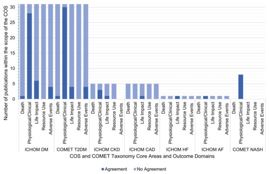A total of 69 outcomes were recommended across the seven COS. There was a range of 10 to 18 outcomes and a median number of 12 outcomes per COS. Five of the seven COS evaluated outcomes originated from all five core areas [4,79,81,82,83]. The COS for NASH/NAFLD only requested outcomes from one of the five (20%) core areas (Physiological/Clinical) [84], and the ICHOM’s CKD COS evaluated three of the five (60%) core areas (all except resource use and adverse events) [80].