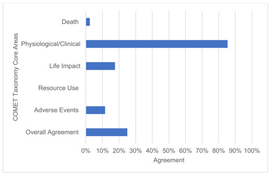 Figure 5 illustrates that 25% agreement was observed between the outcomes reported in the RCT publications and the COS within the COMET taxonomy core areas overall. No RCT publications reported outcomes comparable to those requested by relevant COS across all of the requested core areas. Five of the RCT publications displayed no agreement between their reported outcomes and the COS recommendations [48,50,53,66,76].