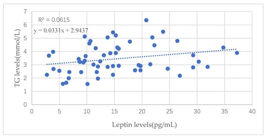 There was a positive correlation between leptin in cord blood and TG levels of pregnant women in the third trimester of pregnancy (p = 0.025), shown in Figure 1, while the leptin had nothing to do with TC levels, HDL-c levels, LDL-c levels or the TC/HDL ratio, TG/HDL ratio, or LDL/HDL ratio (p > 0.05, not shown in figures below).