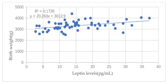 Leptin in cord blood was positively related to newborns’ birth weight (p < 0.001), shown in Figure 2, but was not directly related to infants’ weight at six months and one year old (p > 0.05, not shown in figures below).
