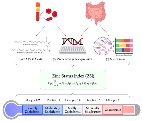 Considering the complexity of Zn metabolism, establishing a panel of biochemical indices is necessary to reliably assess Zn status. We have further developed a Zn status index (ZSI), a three-pillar formula that consists of (1) the LA:DGLA ratio, (2) mRNA gene expression of Zn-related proteins, and (3) fecal microbiome profiling to provide a clear and accurate measurement of Zn physiological status. Our ZSI aims to improve the understanding of Zn nutrition, physiological status, and severity of potential deficiency, which will ultimately lead to effective dietary Zn interventions and medical outcomes [,,]. In this manuscript, we will first review the literature that discusses the rationale behind the three pillars of the ZSI, and then discuss the development and usage of the ZSI.