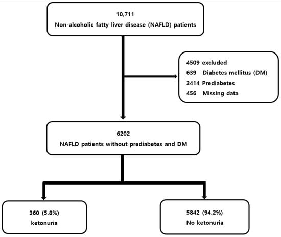 The present study was a cross sectional, retrospective study that assessed the association between fasting ketonuria and an intermediate–high probability of advanced liver fibrosis in NAFLD patients without prediabetes and DM. From January 2010 to December 2017, a total of 53,704 individuals who underwent health screening at the Health Promotion Center of Yeungnam University Hospital were identified. Detailed inclusion and exclusion criteria for 10711 NAFLD patients were identified in a previous publication [].