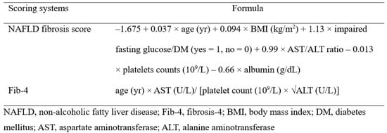 Despite being the gold standard tool for the diagnosis of fibrosis, liver biopsy has the following limitations: lethal complications including uncontrolled bleeding and death, sampling bias, and inter and intraobserver variability, and it is an inapplicable method for large cohort studies []. Therefore, NFS and Fib-4, which consist of anthropometric and biochemical variables, have been widely used to predict advanced fibrosis in large cohorts with NAFLD []. Generally, NFS and Fib-4 have dual COVs, which are the criteria for subdividing the probability of advanced liver fibrosis into low, intermediate, and high. Using the low COVs of the two formulas, the presence of advanced liver fibrosis was defined as an intermediate–high probability of advanced liver fibrosis in this study.