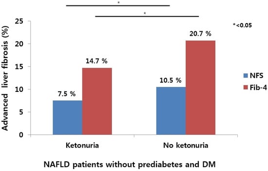 All statistical analyses were performed using R software (version 3.0.2; R Foundation for Statistical Computing, Vienna, Austria). R 3.0.2 was released (26 September 2013) and IBM SPSS version 25.0 (IBM Corp., Armonk, NY, USA). Continuous variables are expressed as mean ± standard deviation or as numbers (%). Differences in variables between the nonketonuria and ketonuria groups in NAFLD patients were calculated using Student’s t-test or chi-squared test. The association between the presence of ketonuria and advanced liver fibrosis using NFS and Fib-4 was identified using logistic regression analysis. With the exception of the variables included in the noninvasive scoring methods for advanced liver fibrosis, we performed sequential adjusted models with confounding variables through multivariate regression analysis. Statistical significance was defined as p < 0.05.