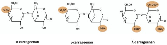 CGN has no nutritive value, and it is widely used as a food additive (E-407) in processed food for its properties as a thickener, gelling agent, emulsifier and stabilizer []. CGN is also used in pet food, cosmetics, textiles formulations and pharmaceutical industries []. The major types, commonly used in food, are ι (iota), κ (kappa) and λ (lambda), which differ in the repetition of the unit sulphation (1, 2 or 3 sulphate group) [] (Figure 1).