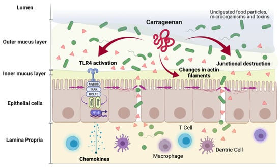 Inflammatory damage associated with carrageenan in murine models shows a histopathological pathway similar to the one known in an inflammatory intestinal condition such as ulcerative colitis (UC). In summary, the carrageenan-activated cascade involves reactive oxygen species and the innate immune pathway including the toll-like receptor (TLR)-4 and B-cell leukemia/lymphoma (BCL)10 [].