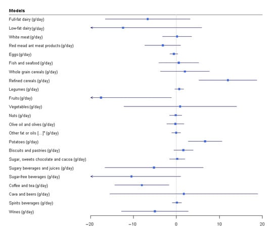 Multiple linear regression models showed that being a participant with a high deprivation index was related to a higher consumption of refined cereals (p-value = 0.001) and potatoes (p-value = 0.001), and to a lower consumption of fruits (p-value = 0.035), and coffee and tea (p-value = 0.012). No significant relationships were observed between the CSI categories and the consumption of other predefined food groups (Figure 1 and Supplementary Table S2).