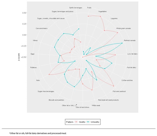 Figure 2 shows the two identified dietary patterns by cluster analysis. Due to their characteristics and affinities, these two patterns have been labeled as “healthy” followed by 704 (46.5%) participants, and “unhealthy” followed by 808 (53.5%). The “healthy” pattern was characterized by a significantly higher consumption of low-fat dairy, white meat, fish and seafood, whole grain cereals, legumes, fruits, vegetables, nuts, olive oil and olives. The “unhealthy” pattern was characterized by a significantly higher consumption of foods rich in fat, sugar and alcohol such as full-fat dairy, red meat and meat products, refined cereals, other fat or oils different from olive oil, full-fat dairy derivatives and processed meals, potatoes, biscuits and pastries, sugar, sweets, chocolate and cocoa, cava and beers, spirits and wines (Supplementary Table S3).