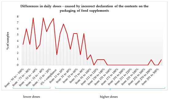 The percentage of food supplements and the difference in the actually taken magnesium dose, resulting from an incorrect declaration of the content.
