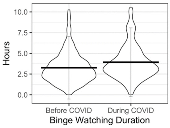 Out of the sample, n = 264 (n = 161 females) reported their approximate binge watching duration during the pandemic and n = 221 (n = 132 females) reported their approximate binge watching duration before the pandemic. Within the reduced sample reporting data both during and before the pandemic, there was a significant difference in duration before (M = 3.26 h, SD = 1.89 h) compared with during the pandemic (M = 3.92 h, SD = 2.08 h); (t(195) = −4.883, p < 0.001; Figure 1). Duration was higher in females at both time points, but the mean differences in binge watching duration between the sexes were not significant before (t(219) = −0.519, p = 0.615) or during the pandemic (t(262) = −1.281, p = 0.201).