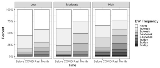 Participants responded to the question “How stressed are you about the following in relation to the COVID crisis” for 16 pandemic-related factors including finances and availability of resources, health and healthcare concerns, job and career concerns, and interpersonal concerns within and outside the home. The ratings (range = 1–5) were averaged over the 16 items into a mean score. Mean stress scores have been linked to child [23] and adult [24] intake, as well as altered feeding behaviors in parents and heightened appetite in adults [23,25]. Stress tertiles were created by splitting the ordered distribution into thirds, resulting in groups reporting low (range = 1–2.21), moderate (range = 2.25–3.09), and high (range = 3.13–5) stress levels.