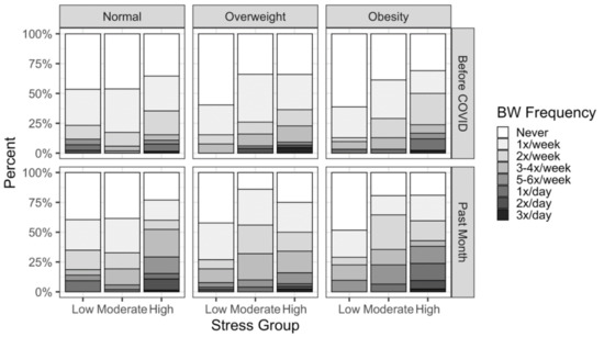 To evaluate the frequency of negative binge watching behaviors within the past week, including the frequency of eating while binge watching, we adapted binge eating questions from the Questionnaire on Eating and Weight Patterns (QEWP-5) [19] by replacing language regarding binge eating with language regarding binge watching. For example, the QEWP-5 question “Did you usually have any of the following experiences during these episodes (eating an unusually large amount of food in a short period of time)—feeling disgusted with yourself, depressed, or feeling very guilty afterward” (with answer choices Yes and No) was changed to “During the past week, how often did you—Start binge watching because you felt depressed or sad about something?” (with answer choices Never, Rarely, Sometimes, Often, and Always). Questions were completed with reference to during, and not before, the pandemic. We chose to adapt items from the QEWP-5, since its goal is to capture potentially pathological behaviors, and we wanted to assess pathological bingeing behaviors that were comparable to those seen around eating in order to facilitate future investigations of commonalities between binge watching and binge eating. We changed the response options from yes/no to a 1–5 Likert scale (never to always) to capture a wider variety of behavioral responses. Our adapted items allowed us to examine how individuals differed in binge watching behaviors by BMI group and COVID-related stress level.