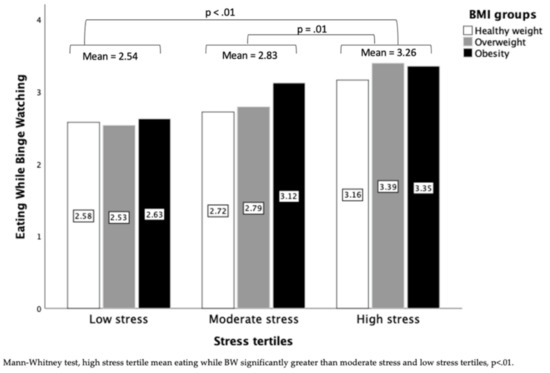 Kruskal–Wallis tests were used to examine stress tertile differences in the 10 negative binge watching behaviors, with Mann–Whitney post hoc testing to probe differences between tertiles. To explore potential differences by BMI group in the effect of stress on the frequency of eating while binge watching, we stratified our sample by BMI group and reran these tests.