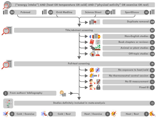 We searched PubMed, Ovid Medline, Science Direct and SPORTDiscus, without temporal restrictions, for relevant articles. The last literature search was performed on 31 May 2021. The search was performed with no restriction of publication date or type. The reference lists of recent publications on this topic and the studies cited were screened for additional references missed in the initial search. We searched for the following indexed terms in the title or abstract: (“Energy Intake”) AND (Heat OR Temperature OR Cold) AND (Physical Activity OR Exercise OR Rest).