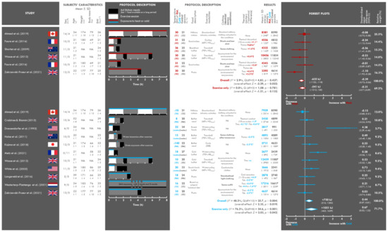 The details of exposure to the different thermal environments are presented in Figure 2. Heat and cold exposure effects were assessed in six and eleven studies, respectively.