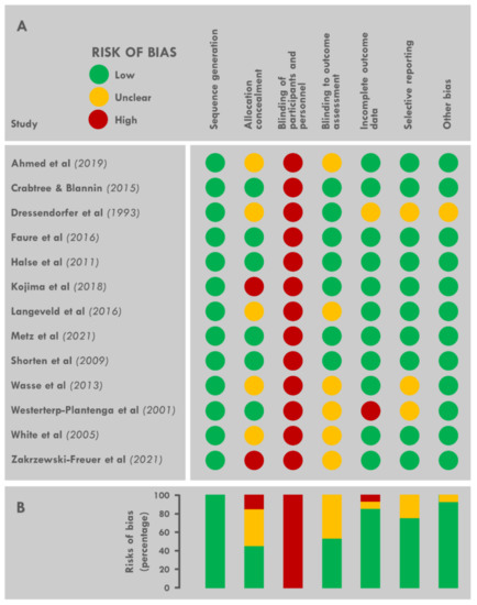 Full details of the risk of bias assessment are provided in Figure 3A. The principal problems detected in the 13 randomized controlled trials were a high risk of bias due to (1) the lack of blinding of participants and study staff to temperature conditions, and (2) the secret assignment of temperature before the start of the study. Information on the blinding methodology for the assessment of energy intake was not clear in most studies. Figure 3B summarizes the proportion of trials with low, unclear, and high risks of bias for each domain. All studies were of high quality according to the Cochrane review criteria.