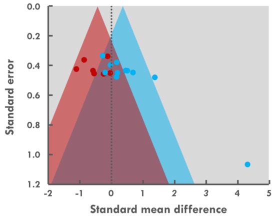 Funnel plot for random-effects model-based meta-analysis of energy intake during or after exposure to heat (red area and dots) or cold (blue area and dots) relative to a thermoneutral environment.