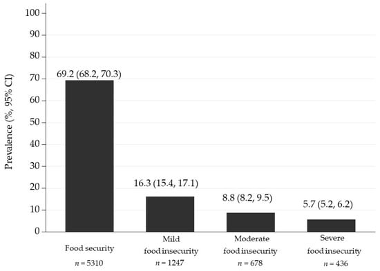 The overall FI prevalence of university student households was 30.8% (95% CI: 29.7, 31.8). The prevalence was 16.3% (95% CI: 15.4, 17.1) for mild FI, 8.8% (95% CI: 8.2, 9.5) for moderate FI, and 5.7% (95 CI: 5.2, 6.2) for severe FI (Figure 1).