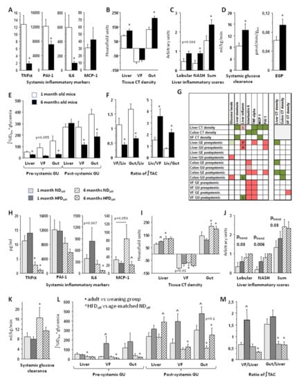 In comparing the weaning reaction in mice born to HFD vs. ND mothers (Figure 1H–L, Supplementary Figure S2), the increase in TNFα, PAI-1, and intestinal glucose extraction and uptake was present in both groups (compared to adult age), but HFDoff tended towards higher levels of IL6, together with a two-to-six-fold elevation in glucose extraction and uptake in visceral fat and (less markedly) in the gut than NDoff. These differences were not seen in adults. Instead, adult HFDoff, were characterized by a 40% elevation in post-systemic hepatic glucose uptake compared to NDoff (Figure 1L). Consequently, in HFDoff the visceral fat/liver (glucose uptake) ratio was very high at weaning (+300%) compared to NDoff (Figure 1M). These patterns suggest that visceral fat and the gut received and sequestered more glucose in the weaning reaction of HFDoff than NDoff, reducing the within-network (i.e., pre-systemic) flux of glucose to the liver, preserving fasting EGP (n.s., not shown) and glucose clearance (Figure 1K). This pre-systemic glucose-sinking effect was lost in adult HFDoff, resulting in a high post-systemic liver glucose uptake and a lack in the physiological increase in systemic glucose clearance observed in NDoff. In addition, the CT density (Figure 1I) in the visceral fat and liver was high in weaning HFDoff, thereby failing to undergo the physiological increase from weaning-to-adulthood, as seen in NDoff. Biopsy data in the available samples demonstrated a significant trend of steatohepatitis grades, worsening across the four age*maternal-diet subgroups (Figure 1J), supporting a summative contribution of age and maternal HFD, in which adult HFDoff had the most severe liver condition with a 40% elevation in circulating triglyceride levels (1.15 ± 0.10 vs. 0.79 ± 0.00 mmol/L, p < 0.003 vs. adult NDoff). This group also lacked the physiological elevation in MCP1 levels observed in age-matched NDoff, thereby showing a four-fold cytokine deficiency (Figure 1H), as previously reported [].