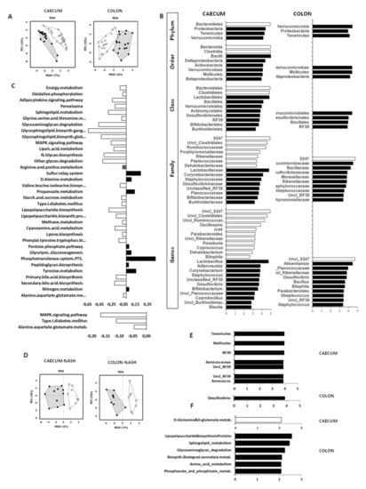Significant differences in caecum and colon microbiota composition between weaning (white circles) and adult mice (black dots) are shown in RDA analysis (A), whereas LDA/LEFSe analyses (B) identify unique bacteria taxa biomarkers of weaning mice (white bars) and adult mice (black bars). Significant differences in metabolic pathways from KEGG analysis are expressed as ratios in panel (C), in which negative white bars indicate pathways prevailing at weaning, and positive black bars refer to pathways prevailing in adults. Panel (D) shows RDA analysis in animals stratified by the presence (black) or absence of NASH (white), and the corresponding significant unique biomarkers are given in panel (E) (bacteria taxa) and (F) (metabolic pathways).