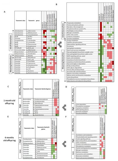 Microbiota richness decreased significantly in the caecum from 1 to 6 months of age only in adult HFDoff. We have previously reported a description of differently abundant taxa in HFDoff and NDoff, together with KEGG pathways in the colon []. In the current study, we extended KEGG analyses to the caecum, and we presented differences in the pathways related to substrate metabolism and inflammation in both the caecum and colon ( Supplementary Figure S3). In Figure 3C–F and Supplementary Table S2, we selected the tissue parameters that were significantly different between age-matched HFDoff and NDoff, and the bacteria (family and genus level) and metabolic pathways showing significant correlations with these parameters. These involved an enrichment in Clostridia and Bacteroidia classes, and the Tenericutes-RF39 genus, and a depletion in the Anaerotruncus genus in weaning HFDoff vs. NDoff, correlating with the observed metabolic features characterizing HFDoff at this age (increased visceral fat and intestinal glucose uptake). In adult HFDoff, showing high liver and intestinal glucose uptake (vs. NDoff), the associated biomarkers were Desulfovibrio and Allobaculum genera, Clostridiales order (Unclassified Clostridiales genera, Peptococcaceae family), and Coriobacteriaceae family. In the KEGG analysis, only three amino-acid related pathways (lysine, phenylalanine, tryptophan) were simultaneously associated with the maternal diet and with the tissue differences observed at weaning. In adults, the upregulation of insulin signaling and downregulation of nitrogen metabolism and butyrate (short-chain fatty acid) pathways detected in HFDoff were predictors of histological liver inflammation, whereas pathways regulating arachidonic acid, glycan, sulfur, and amino-acid functions were associated to the imaging outcomes.