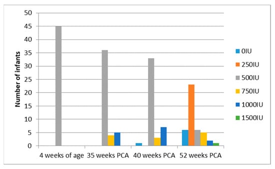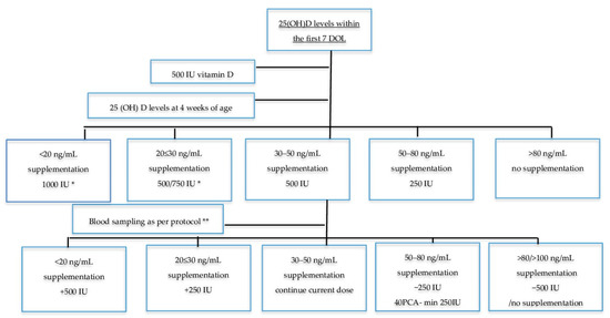 Infants of >7 d of age received 500 IU vitamin D (“Devikap” cholecalciferolum, Polpharma, Poland) as per the local protocol. After full enteral feeding was established, vitamin D supplementation consisting of 500 IU and 150–300 IU/kg was included in human milk fortifiers (if fed exclusively with breast milk) or 190 IU/kg in milk formula, depending on the type of feeding (800~1000 IU in total). Blood samples for 25(OH)D concentrations were obtained at 4 weeks of age, and subsequent measurements at 8, 35, 40, and 52 weeks of PCA. Vitamin D doses were appropriately modified based on 25(OH)D concentrations in the monitored group (Figure 1). We hypothesized that most VDD cases in infants are secondary to low maternal status. Thus, we increased vitamin D supplementation by 500 IU in such cases with low vitamin D status at 4 weeks of age, which allowed us to reach higher recommended levels of 1000 IU/day [14]. Blood samples obtained from the randomized infants on standard therapy had the same results as the monitored group but without any changes in dose.