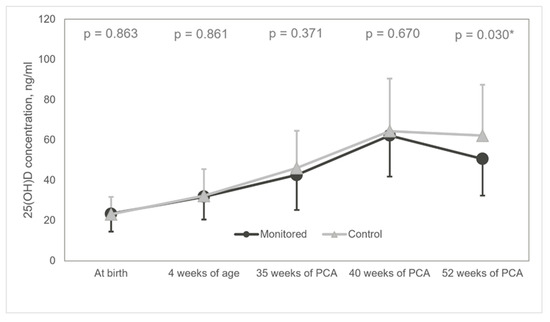The primary endpoint was the number of neonates with deficient or excess vitamin D levels at 40 ± 2 weeks of PCA. Additional 25(OH)D concentrations were performed at birth, 4 and 8 weeks of age, and 35 and 52 ± 2 weeks of PCA. Neonatal nurses collected venous blood samples in glass specimens to assess 25(OH)D concentrations in pre-specified time frames (Figure 1).
