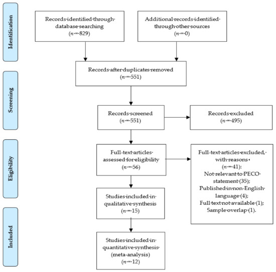 A total of 829 articles were identified through database search (Figure 1). Titles and abstracts of 551 articles were screened for relevance, after removing duplicates. Once potentially relevant studies were identified, a total of 56 full-text articles were assessed for eligibility. Studies not fulfilling these criteria were excluded from the analysis (n = 41) (Supplementary Materials, Section B). Two studies by Rocha et al. [22,34] included two overlapping patient cohorts. To avoid duplicate publication bias, we included the study with more complete information [34]. From the included studies, only 12 provided data on BMI or the prevalence of overweight, qualifying them for quantitative analysis [7,18,25,26,30,31,32,34,35,36,37,38].