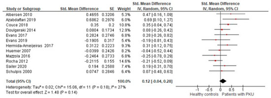 In the 12 studies included in the meta-analysis, there were no differences for BMI of patients with PKU compared with healthy controls (SMD = 0.12 [−0.04, 0.28], p = 0.14; I2 = 27%, p = 0.18; Figure 3).